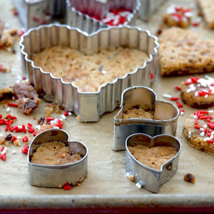 Playing with an idea for Valentine’s Day... I always make treats for friends and employees... Today I made a chocolate chip cookie bark with pulverized hard caramel candy sprinkled on top before baking... The cookie bark smells amazing! I used every heart cookie cutter I have plus a few others to cut shapes into the baked dough as soon as it came out of the oven. Some of the cookie cutters stayed with the cookie in them which is what I had hope for, but for the cutters that came off, the cookie shapes themselves are very smooth and clean cut, which is perfect and also so hard to achieve with a chocolate chip cookie dough that’s not a shortbread. I want that chocolate chip cookie taste in a cookie bark form....then the rest uncut dough I wanted to break up into chunks like a chocolate bark. I bagged one of each and I’m pretty pleased! Very cute! I want to try reducing the butter a bit in the recipe bc I find them to be a bit greasy but work in progress. Not bad for stage 1. Recipe to