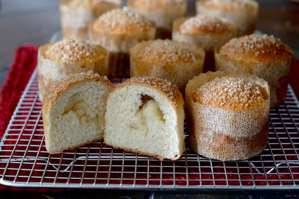 To make the dough, combine your dry ingredients with your wet ingredients in a big bowl (or mixer bowl) all at once and mix by hand or dough hook until it comes together. If the dough is too dry add a teaspoon of water at a time until it comes together. It’s ok if it’s a little dry, you don’t want to add too much water and have a sticky mess. If making by hand dump the dough on a lightly floured surface and knead 8-10 minutes until the dough is smooth, adding flour a tiny bit at a time to keep it from sticking. If using a mixer knead on medium speed with a dough hook until the dough pulls away from the bowl adding a little flour as needed, 8 minutes or so. When the dough is smooth put the dough in a greased bowl, cover bowl with plastic wrap and let the dough rest 4-6 hours in the refrigerator. You want to give the dough time to relax and rise slowly. Once the dough has rested and chilled, lightly flour a clean surface and take the dough out of the bowl and divide into 2-3 ounce pieces, the size is up to you. Roll gently into balls, as the dough warms up it will roll easier but you don’t want warm dough. Let the dough balls rest for 15-20 minutes covered. Preheat the oven to 375 degrees and grease individual baking cups or like I used, mini panettone molds, or even cupcake liners lightly sprayed as well. You should get 10-12 3 ounce rolls.