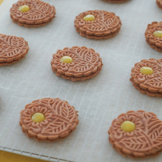 In a mixer (or by hand but get ready to get a workout) blend the slightly softened butter with the sugar and freeze dried strawberry powder until well blended and fluffy, 2-3 minutes. Once blended add the egg and vanilla and mix until incorporated. Now add all of your dry ingredients and mix until it comes together. Split the dough into 2 balls, flatten them into disks, wrap in plastic wrap or a ziplock and chill. Chill for at least 4 hours but ideally overnight. When ready to bake, preheat the oven to 375 degrees and line a baking sheet with parchment. Dust a clean surface with some flour and roll the dough out to about 1/4 inch thick while still chilled. You don’t want the dough to soften too much before rolling, if it does stick it back in the fridge. Cut your shapes out (or stamp them using these mooncake molds) and put them on the prepared baking sheet about 1 inch apart. Place them back in the fridge to chill, and while those chill, roll out the other half of the dough and repeat the steps above. Chill the second cookie sheet while the first one bakes. The cookies should take about 8-10 minutes at 375 degrees but watch them because it depends on their size and thickness. Cool before filling.
